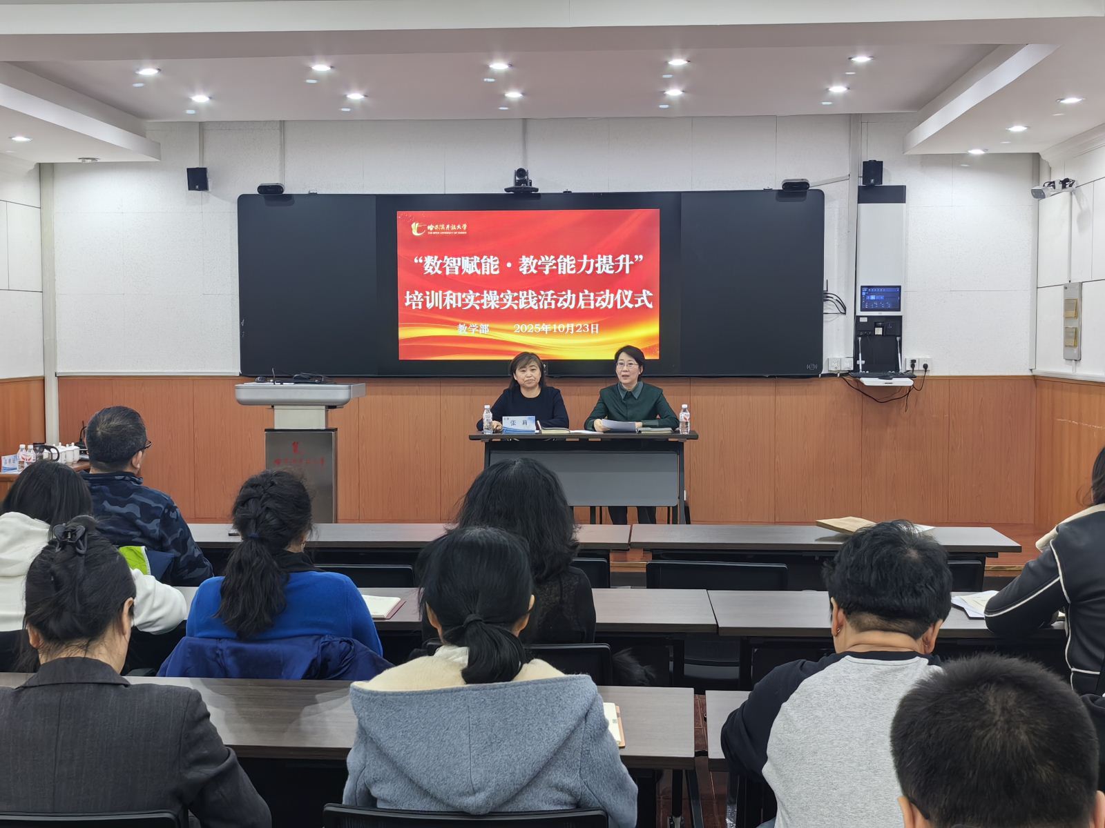 10月23日下午,“数智赋能·教学能力提升”培训和实操实践活动启动仪式在303教室举行。本次活动由教学部与科研与信息技术中心联合主办,旨在深入贯彻落实国家开放大学《数智赋能一体化协同推进开放大学教育教学综合改革实施意见》,通过系统化培训与实操实践,全面提升教师的数字化教学素养与实践应用水平,为学校教育教学综合改革提供坚实支撑。副校长张莉出席仪式并讲话,教学部部长孙连娟主持仪式,教学部全体教师参加活动。