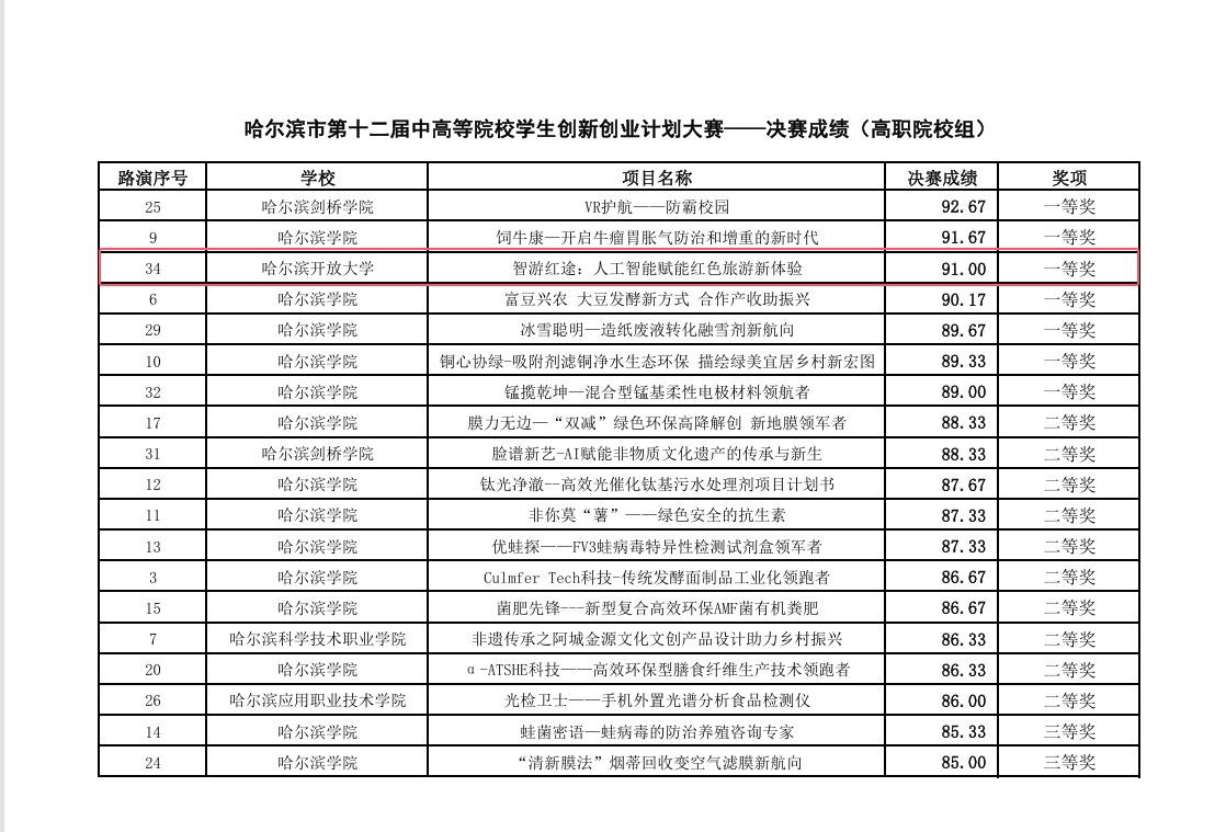 11月12日,由市教育局、市教育研究院联合举办的哈尔滨市第十二届中高等院校学生创新创业计划大赛圆满落幕。爱游戏(ayx)中国官方网站推选项目“智游红途”,经初审、复赛、决赛最终获得一等奖。