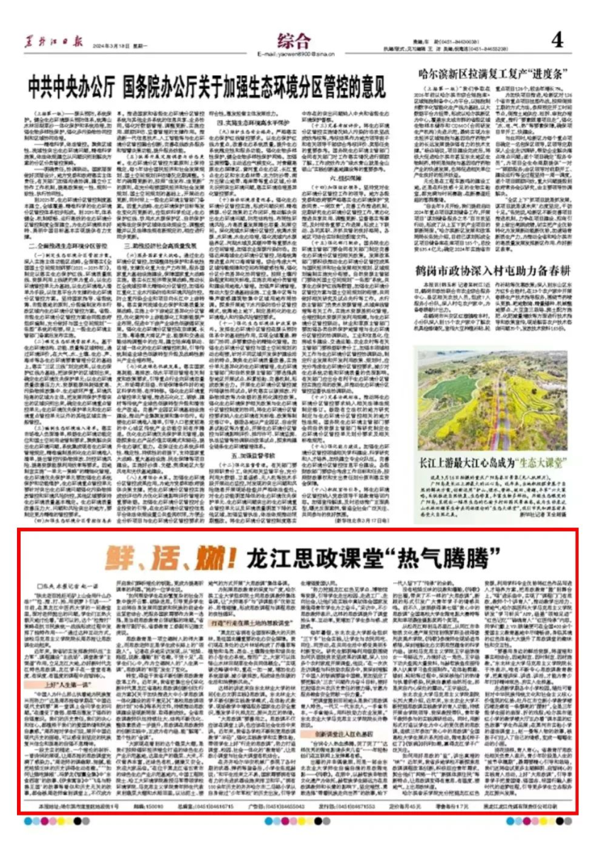3月18日,《黑龙江日报》报道我省切实发挥教师队伍“主力军”、课程建设“主战场”、课堂教学“主渠道”作用,立足龙江大地,办好新时代龙江特色思政课,龙江学子在一堂堂有高度、有深度、有温度的课程中启智润心。
