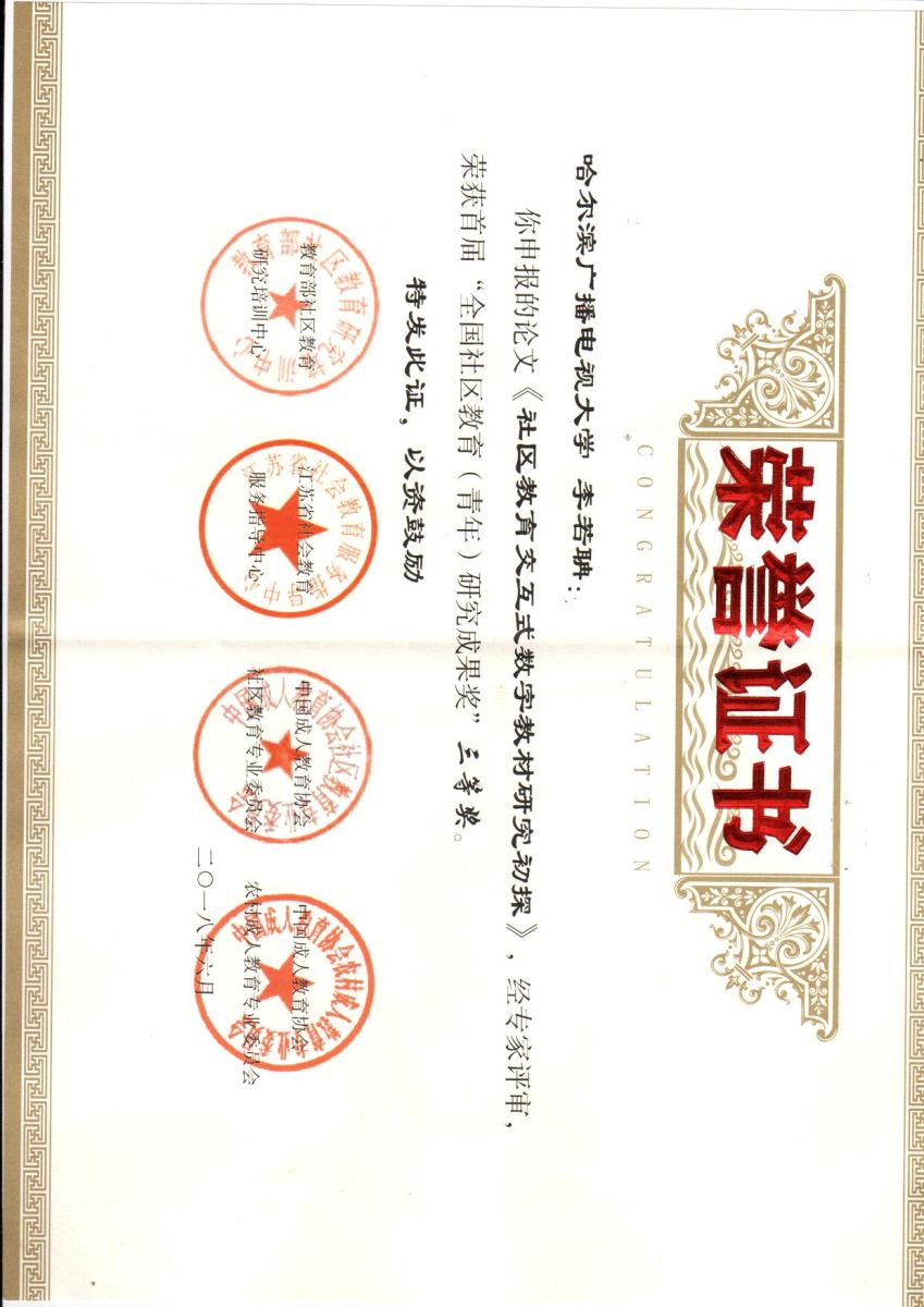 首届全国社区教育(青年)研究成果奖获奖名单于日前公布,爱游戏(ayx)中国官方网站教师李若聃所撰写的论文《社区教育交互式数字教材研究初探》在近百篇成果中脱颖而出,荣获三等奖。李若聃长期参与社区教育工作,善于把握工作规律、创新工作方法。交互式数字教材应用于社区教育即是一种有益尝试。首届全国社区教育(青年)研究成果奖是由教育部社区教育研究培训中心、中国成人教育协会社区教育专委会和农村成人教育专委会联合评选。