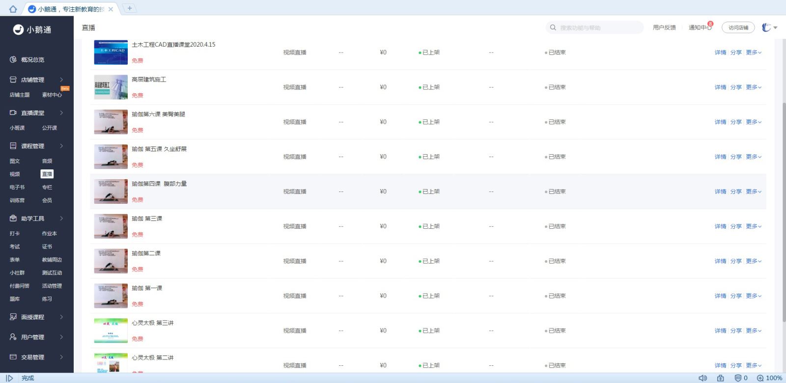 结合职业教育和开放教育特点,引入“小鹅通”直播平台,支持开展线上直播教学活动。为适应疫情时期教育教学授课,现代教育技术处将直播平台的运行环境、功能作用、操作方法编制成平台《使用说明》。3月初平台在中等职业教育学生的网上课程中开始试运行,通过直播平台开展《心理辅导》和《室内瑜伽》等两门课程的网上教学活动。开放教育教学与辅导也已全面展开,现代教育技术处将为教师直播授课提供全面技术支持服务。