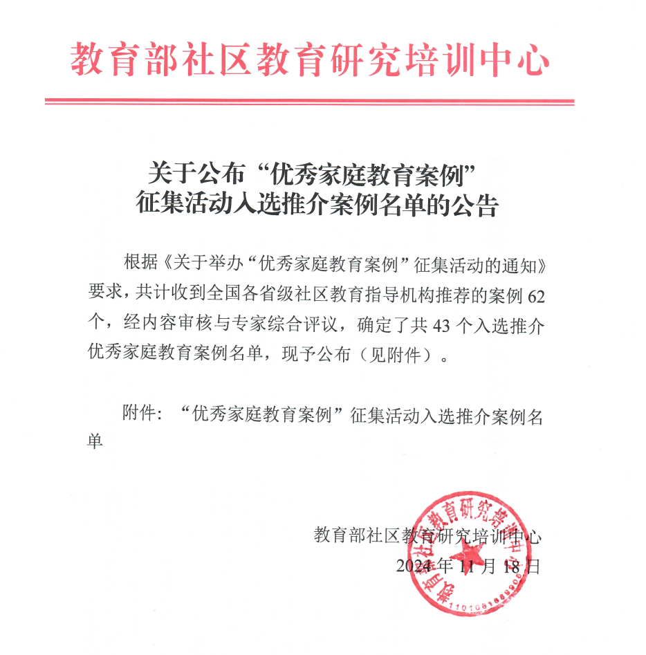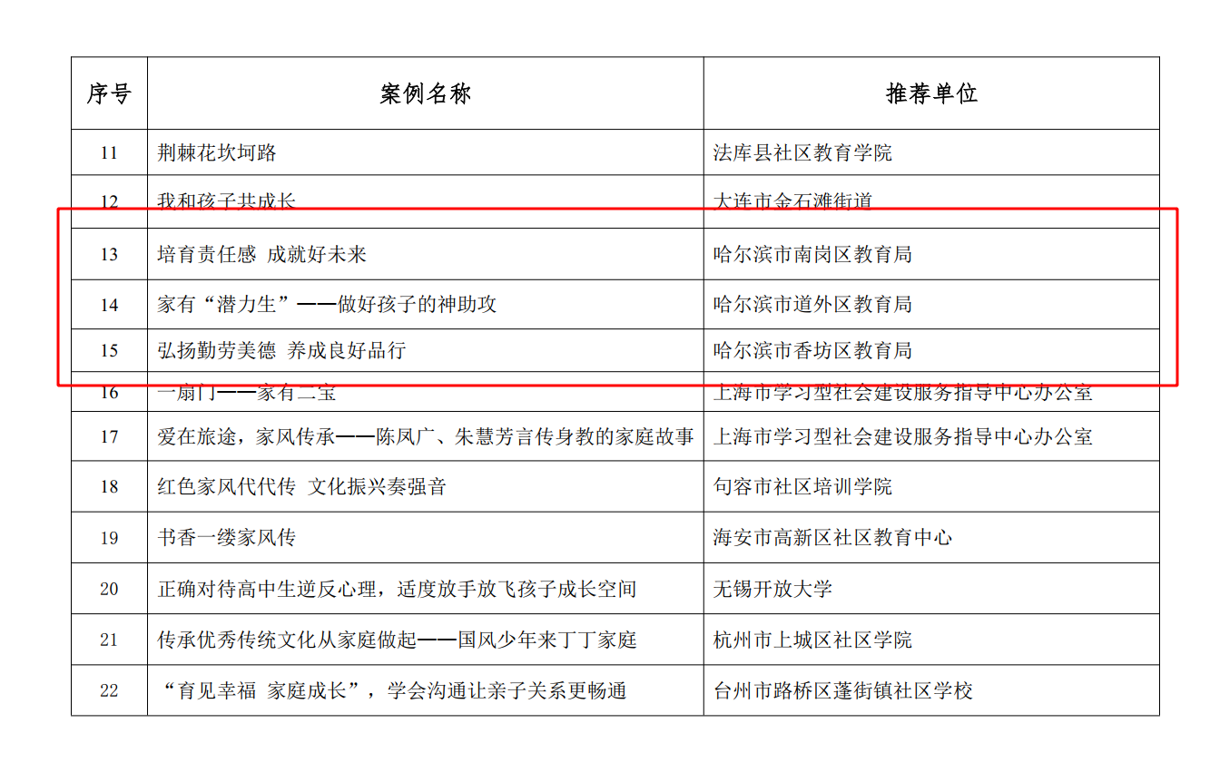 今年6月份爱游戏(ayx)中国官方网站(哈尔滨市社区教育指导中心)与市教育局、市妇联联合举办了“首届新时代家庭教育优秀案例征集活动”,围绕家庭家教家风建设设置9类主题,征集各区县(市)优秀案例32个,经专家评审一等奖优秀案例推荐参与教育部社区教育研究培训中心“优秀家庭教育案例”征集活动。11月18日,教育部社区教育研究培训中心公布了入选推介案例名单的公告,我市南岗区教育局、道外区教育局、香坊区教育局推荐的三个案例入选“优秀家庭教育案例”。