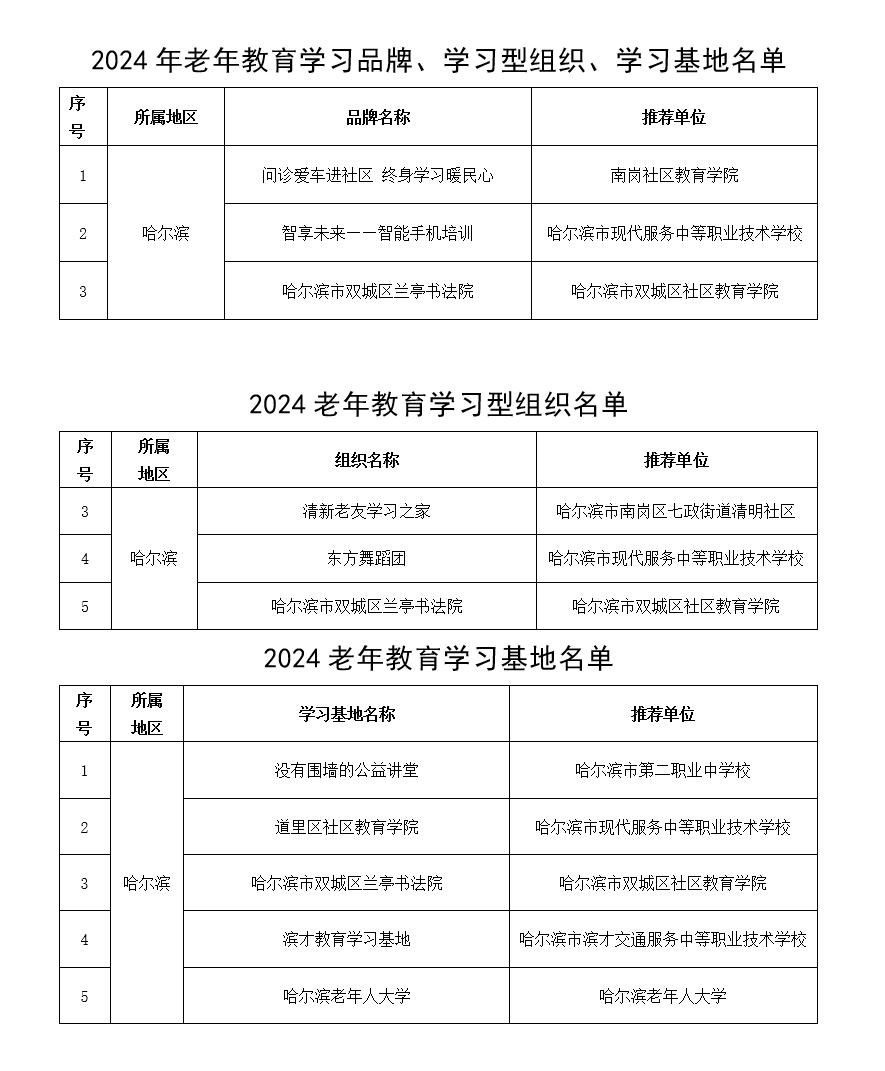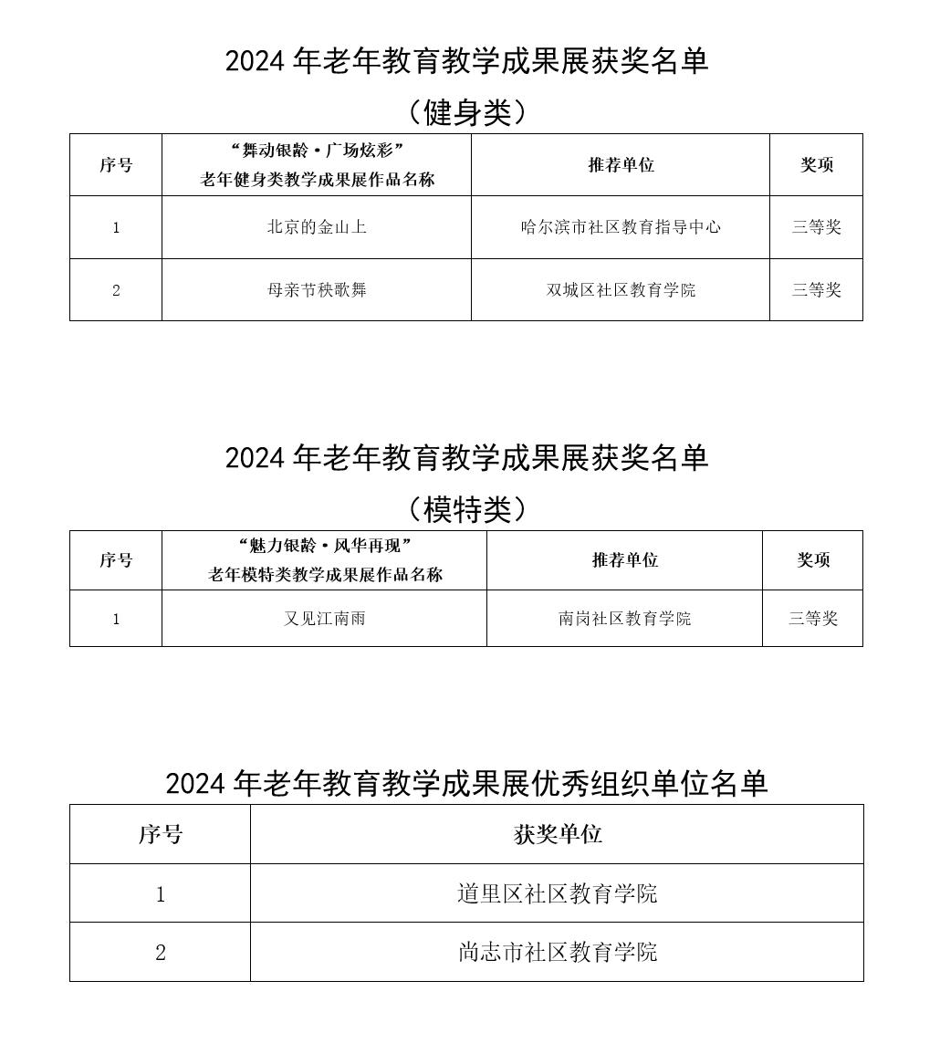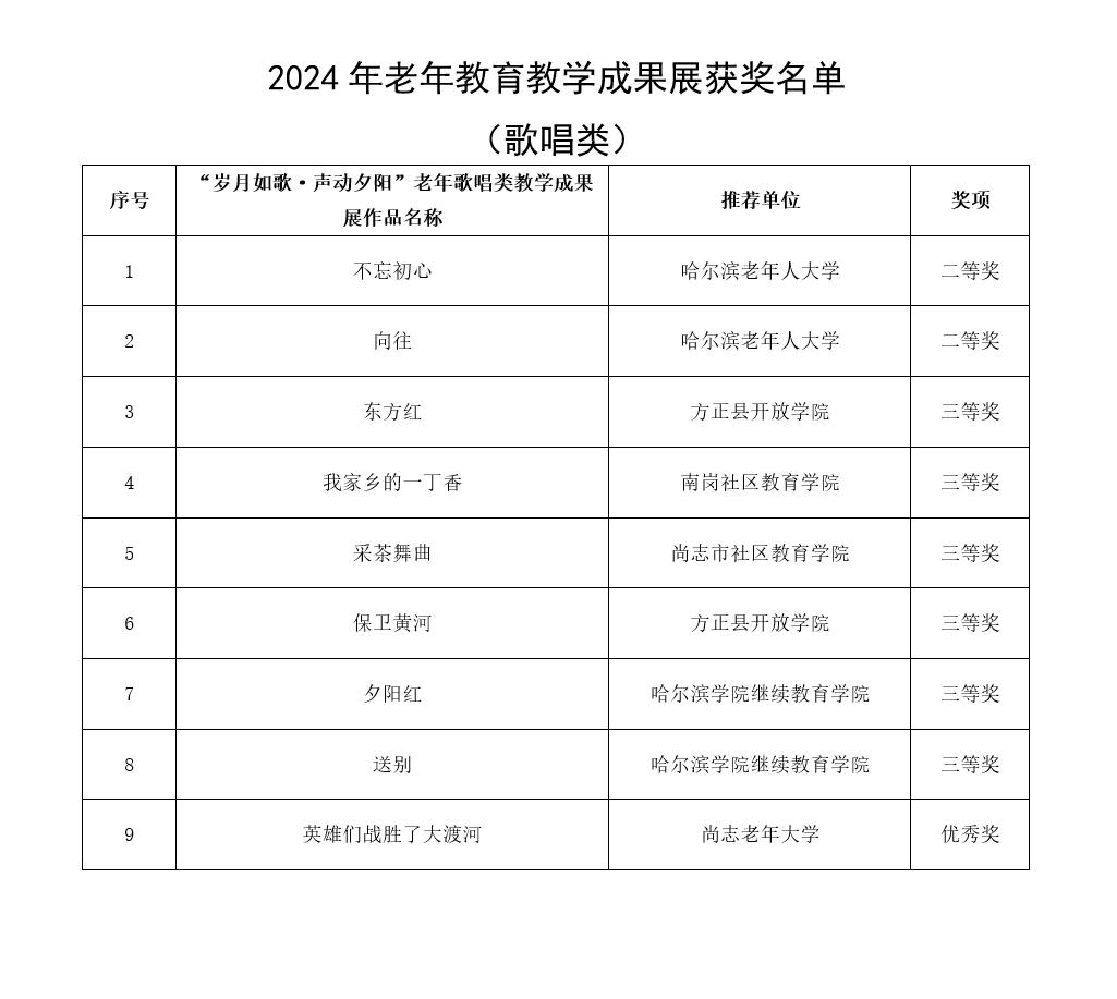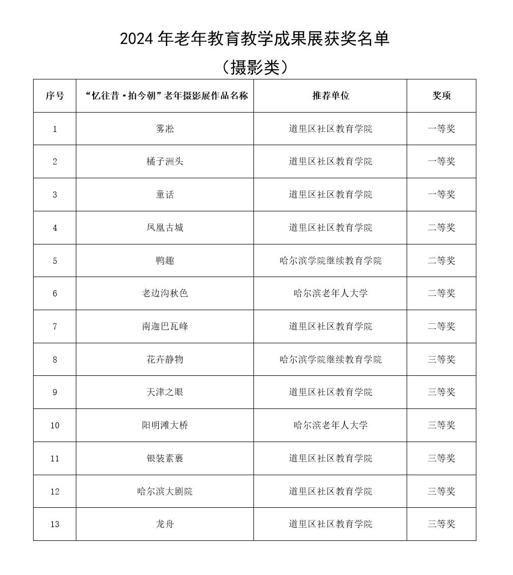 在哈尔滨市教育局的大力支持下,市社区教育指导中心精心组织,我市多个机构及作品上榜,成果极为丰厚。其中哈尔滨学院的《义勇军进行曲》的演唱及情感表达、尚志市社区教育学院的《我的中国心》2项案例入围“2024年全省老年教育课程思政教学案例”。南岗社区学院的“问诊爱车进社区 终身学习暖民心”等三个品牌入选为老年教育学习品牌;南岗区七政街道清明社区“清新老友学习之家”等三个组织入选老年学习型组织;哈尔滨市第二职业中学校的“没有围墙的公益讲堂”、哈尔滨市现代服务中等职业技术学校的“道里区社区教育学院”等五个基地入选老年教育学习基地。在老年教育教学成果展中,《雾凇》等13项作品荣获“忆往昔·拍今朝”老年摄影展奖项;《不忘初心》等9项作品荣获“岁月如歌·声动夕阳”老年歌唱类教学成果展奖项;《东方红》等10项作品荣获“轻舞颂诗·韵动夕阳”老年舞蹈类教学成果展奖项;《北京的金山上》等2项作品荣获“舞动银龄·广场炫彩”老年健身类教学成果展奖项;《又见江南雨》荣获“魅力银龄·风华再现”老年模特类教学成果展奖项;道里区社区学院、尚志市社区教育学院荣获老年教育教学成果展优秀组织单位。