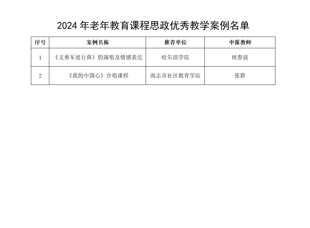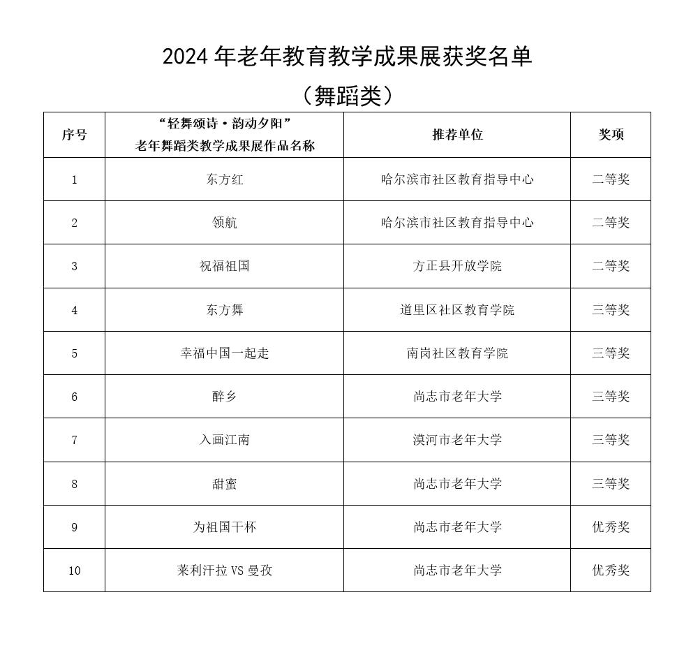 12月9日,省教育厅组织开展的2024年全省老年教育课程思政教学案例的征集、全省老年教育教学成果展以及老年教育学习品牌、学习型组织、学习基地等申报工作,经各市(地)教育局推荐、专家评审,最终评审结果确定并进行了公示(http://jyt.hlj.gov.cn/jyt/c110481/202412/c00_31791222.shtml)。