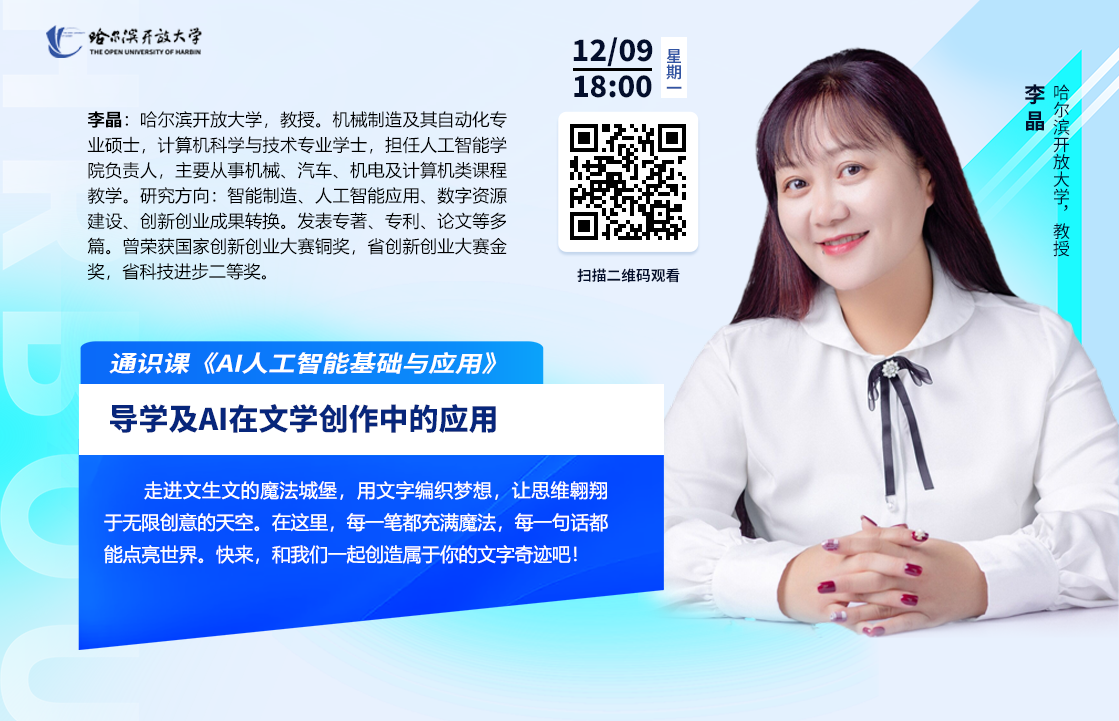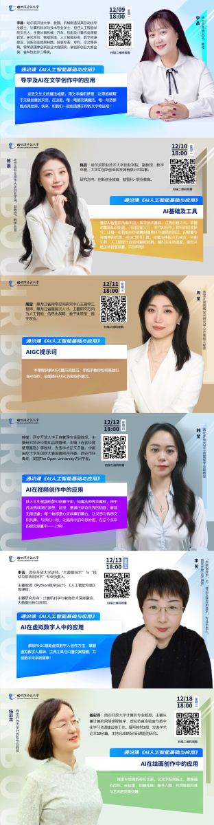 随着AI人工智能的蓬勃发展, 我们该如何巧妙驾驭AI工具,了解它如何影响着我们的日常生活和未来趋势? 又如何利用AI为生活添上一抹亮丽色彩? 面对多样化的学习任务,我们怎样精准挑选出最适配的AI伙伴? 如何让AI更加贴合我们的个性化需求? 如何让文字翩翩起舞、图片绚烂夺目、视频精彩纷呈、编程效率倍增? 爱游戏(ayx)中国官方网站与西安开放大学联合推出《AI人工智能基础与应用》通识课系列讲座,12月9日-18日连续6场,线上直播,触手可及。 每一场讲座,都是解锁AI应用新技能的钥匙,让我们携手并进,拥抱智能时代,共同开启人工智能的新篇章!