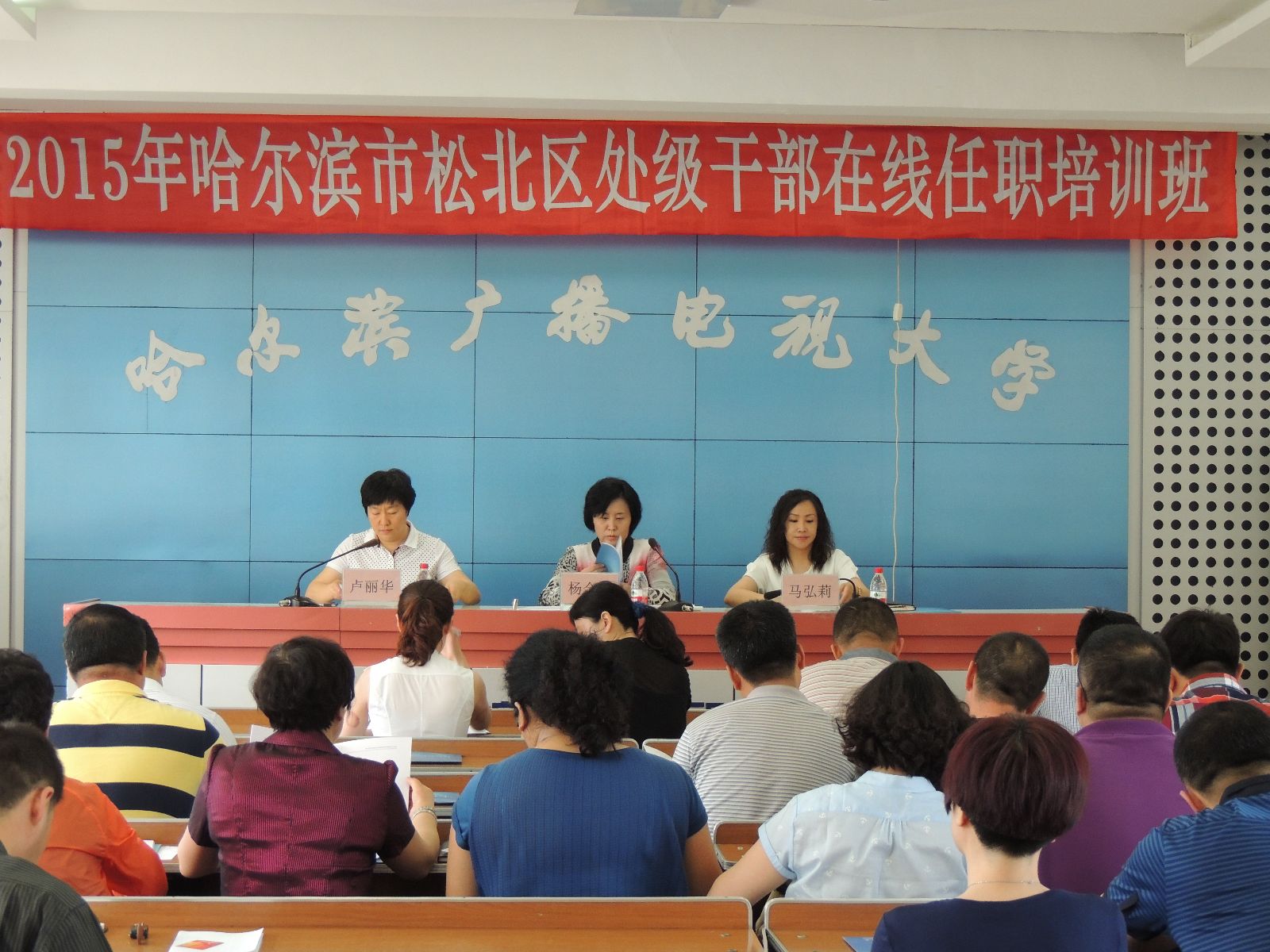 6月15日,2015年哈尔滨市松北区处级干部在线任职培训班在爱游戏(ayx)中国官方网站正式开班。松北区各委办局的新任职处级干部46人参加开班式。