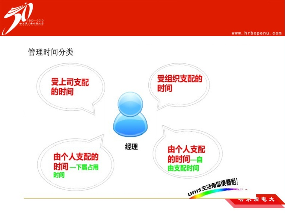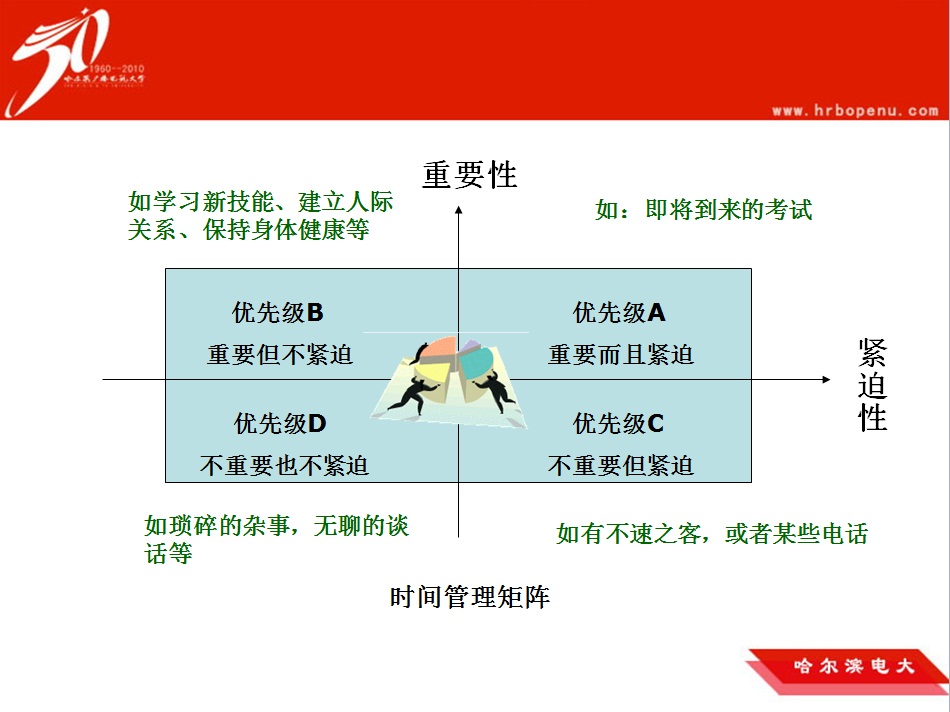 5月29日下午爱游戏(ayx)中国官方网站2019年度第二期教师讲坛在502教室举行。本次讲坛由人文教学部行政管理教研室赵丽老师带来的主题为《SMART目标与时间管理》的讲座。赵老师首先讲解了SMART的五个目标,即目标的明确性(Specific)、可衡量性(Measurable)、可达到性(Attainable)、现实性(Realistic)、有时间规定性(TimeSpecific)等目标的含义;通过时间跟踪表直观的展示了半个工作日中有效工作时间的占比,每天要减少无效工作时间,提高工作效率;接下来讲述了时间管理小故事,利用鹅卵石-碎石子-沙子-水如何放置于容器中的道理,提醒我们按照工作的重要性和紧迫性的来确定处理工作的先后顺序;最后通过谁背上了“猴子”的管理理论讲解了时间管理的重要性。