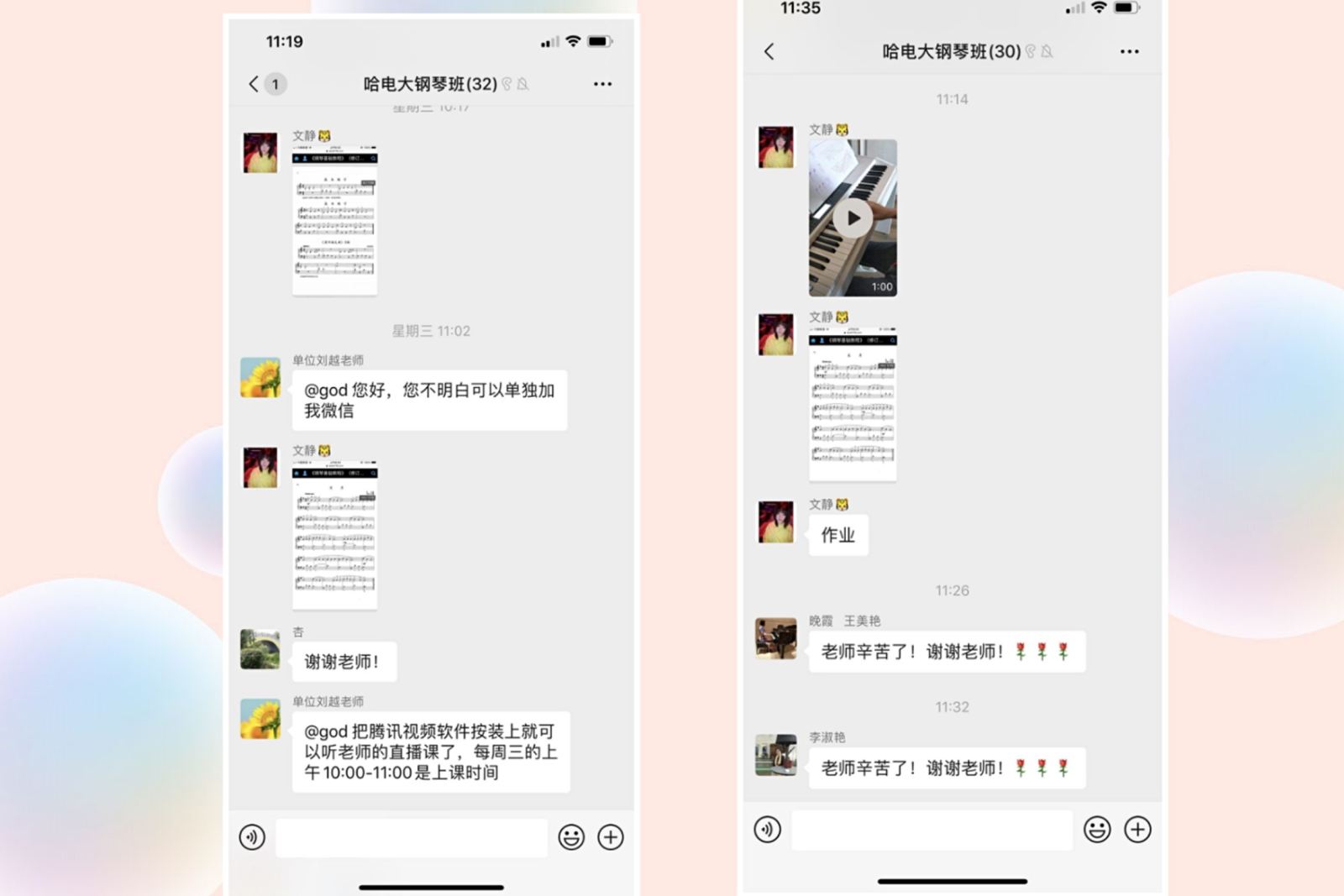 直播课上,邹老师对上学期的课程进行了简单的回顾,并教授新课《黄河船夫曲》,先由教师进行示范,再由学员逐一进行弹奏,师生之间线上交流、互动,邹老师也悉心的为学员答疑解惑,课后邹老师在哈电大钢琴班级微信群分享简谱和弹奏时的指法视频,为学员布置作业《五月》。邹老师耐心细致的教学深深感染着每一位学员,纷纷在班级群向老师表示感谢。学员们表示,直播课堂不仅满足了求知欲,还充实了疫情期间宅家生活,拉近了彼此之间的距离,消除了孤独感。