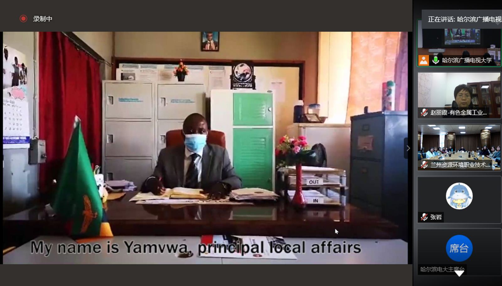 开班仪式上,哈电大刘建国校长向与会领导和全体学员致欢迎辞,刘占荣部长和赵丽霞处长先后讲话;两名专班学员代表(哈尔滨职业技术学院机电工程学院院长雍丽英、北京工业职业技术学院国际合作处副处长孟晴)分别做线上、线下表态发言。梁赤民院长就“国家开放大学赞比亚学习中心和工业汉语培训”作线上专题介绍。