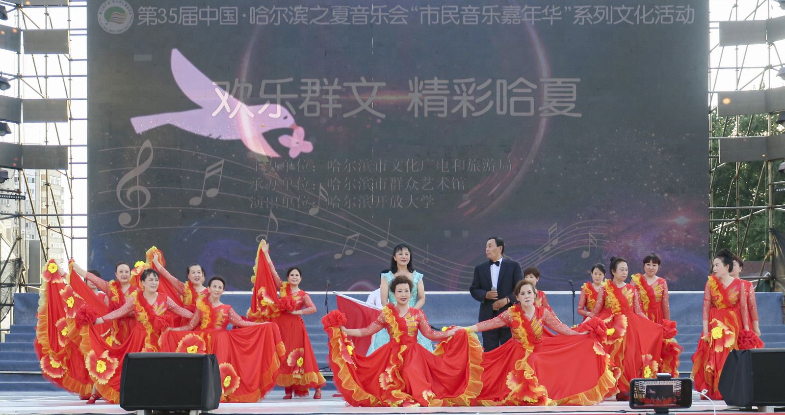 虽然哈市连日高温,下午地面温度高达33度,但是并没有阻挡演员和观众的热情,台上激情澎湃,台下掌声不断,台上台下呈现一派热烈的景象,许多过往的行人驻足观看,受到现场观众一致好评,圆满完成了此次活动。