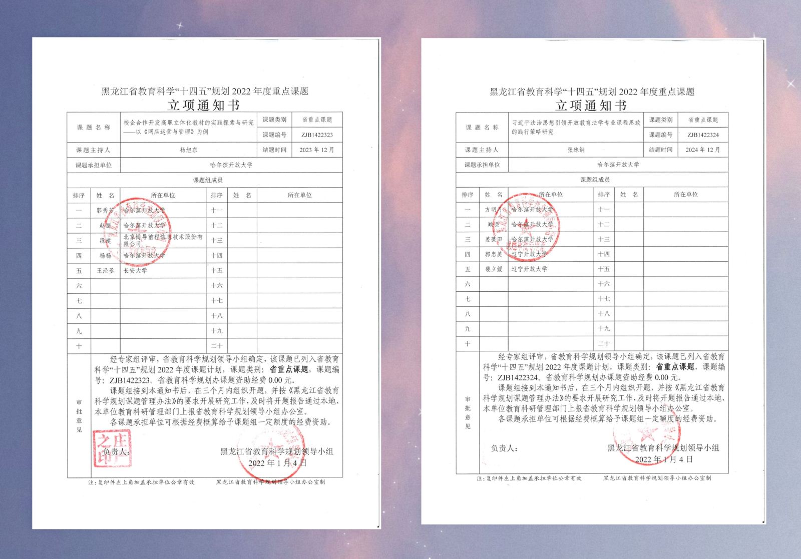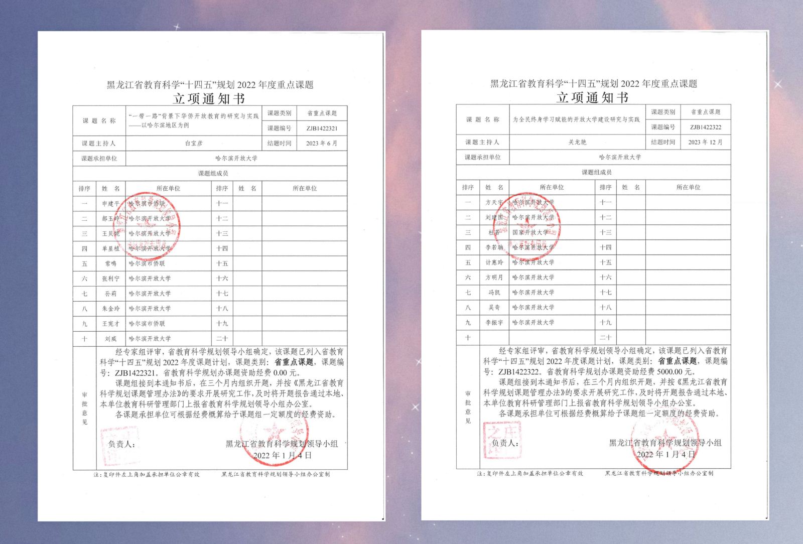 近日,黑龙江省教育科学规划办公布2022年度省重点课题名单,爱游戏(ayx)中国官方网站申报的4项课题准立项,其中1项课题获得经费资助。