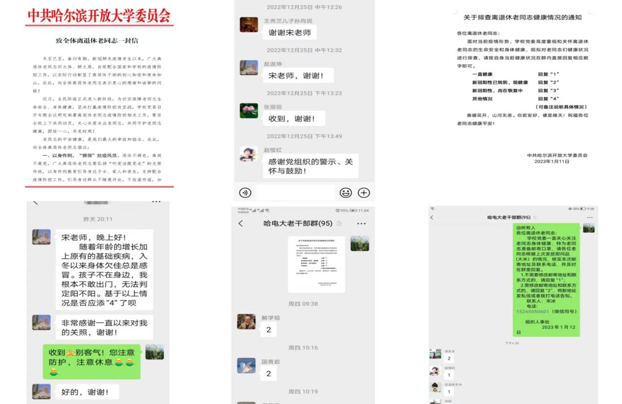 1月18日,校党委以电话、微信等方式贴心关怀、慰问老同志,送去诚挚问侯和新春祝福,校领导向老领导们汇报了2022年度工作情况和取得成绩,以及2023年的工作目标和重点任务。各位老领导是哈开放大学改革发展事业的奋斗者和见证者,过去一年取得的成绩与老领导们打下的坚实基础密不可分。希望各位老领导一如既往地关心和支持学校改革发展工作,为各项工作献计献策,一路同行。老领导们对新领导班子给予的关怀表示感谢,并对学校一年来的成绩表示高度认可,对学校未来发展势头和未来前景充满信心。衷心祝愿哈开大在2023年取得更辉煌的成绩,并对哈开大干部职工致以美好的新春祝福。