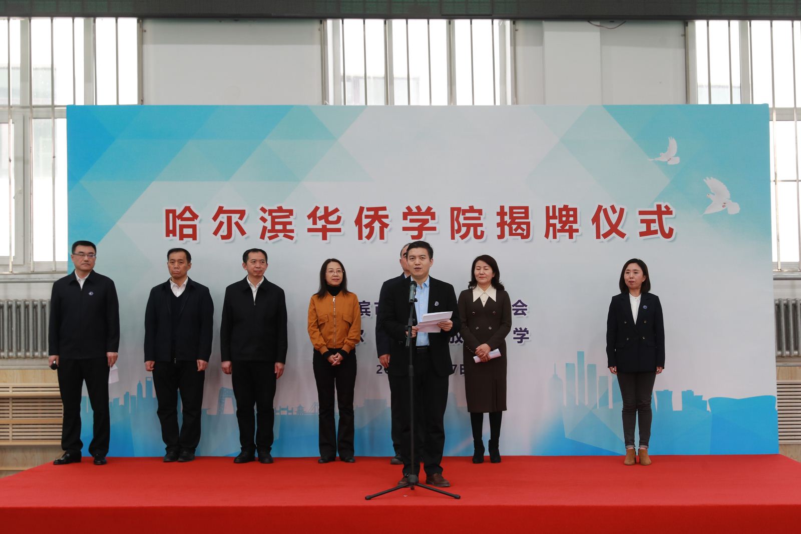 4月27日,哈尔滨华侨学院揭牌仪式在爱游戏(ayx)中国官方网站举行。省侨联党组书记、主席郭占力,市侨联党组书记、驻会主席申建平,爱游戏(ayx)中国官方网站党委书记刘建国,市委统战部副部长、市侨办主任孙晓梅,市侨联党组成员、秘书长杨为涛,爱游戏(ayx)中国官方网站副校长关龙艳,香港商报黑龙江办事处主任付彦华等出席仪式。爱游戏(ayx)中国官方网站纪委书记孙志国主持仪式。