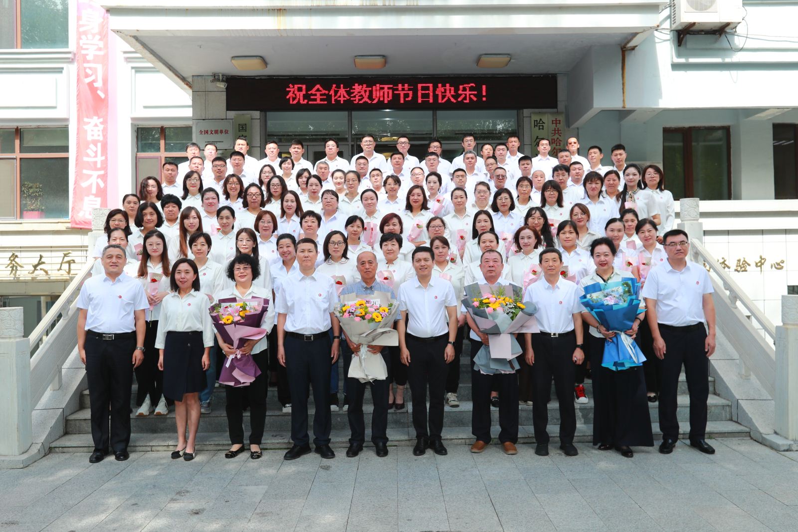 会议洋溢着热烈的节日氛围。会前校领导为全校教职工献花,送去节日祝福。大会在工作宣传片的回顾中拉开帷幕,副校长关龙艳代表学校致教师节献词,10位青年教师为教师节献礼诗朗诵《教师颂》,全体教师诵读誓词。会议现场播放了来自学生的祝福视频。