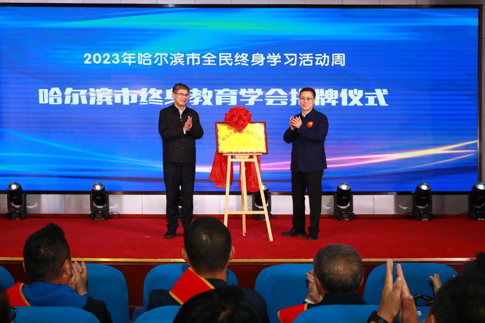 开幕式紧紧围绕“推进数字教育 建设学习型社会”这一主题,以习近平新时代中国特色社会主义思想和习近平总书记关于教育的重要论述为指引,通过社区教育影像视频宣传、百姓学习之星、终身学习品牌项目等成果展板、表彰奖励、经验交流等方式全面展示了哈尔滨市在推进全民终身学习,促进冰城振兴发展,构建服务全民终身学习教育体系和落实老年教育发展战略,加快推进教育强国、文化强国和学习型社会建设过程中取得的丰硕成果。会上,表彰了22名哈尔滨市“百姓学习之星”、15个“终身学习品牌项目”。开幕式上,教育局何泉局长、爱游戏(ayx)中国官方网站白宝彦校长共同为哈尔滨市终身教育学会揭牌,党委副书记陈永昕宣读表彰决定。