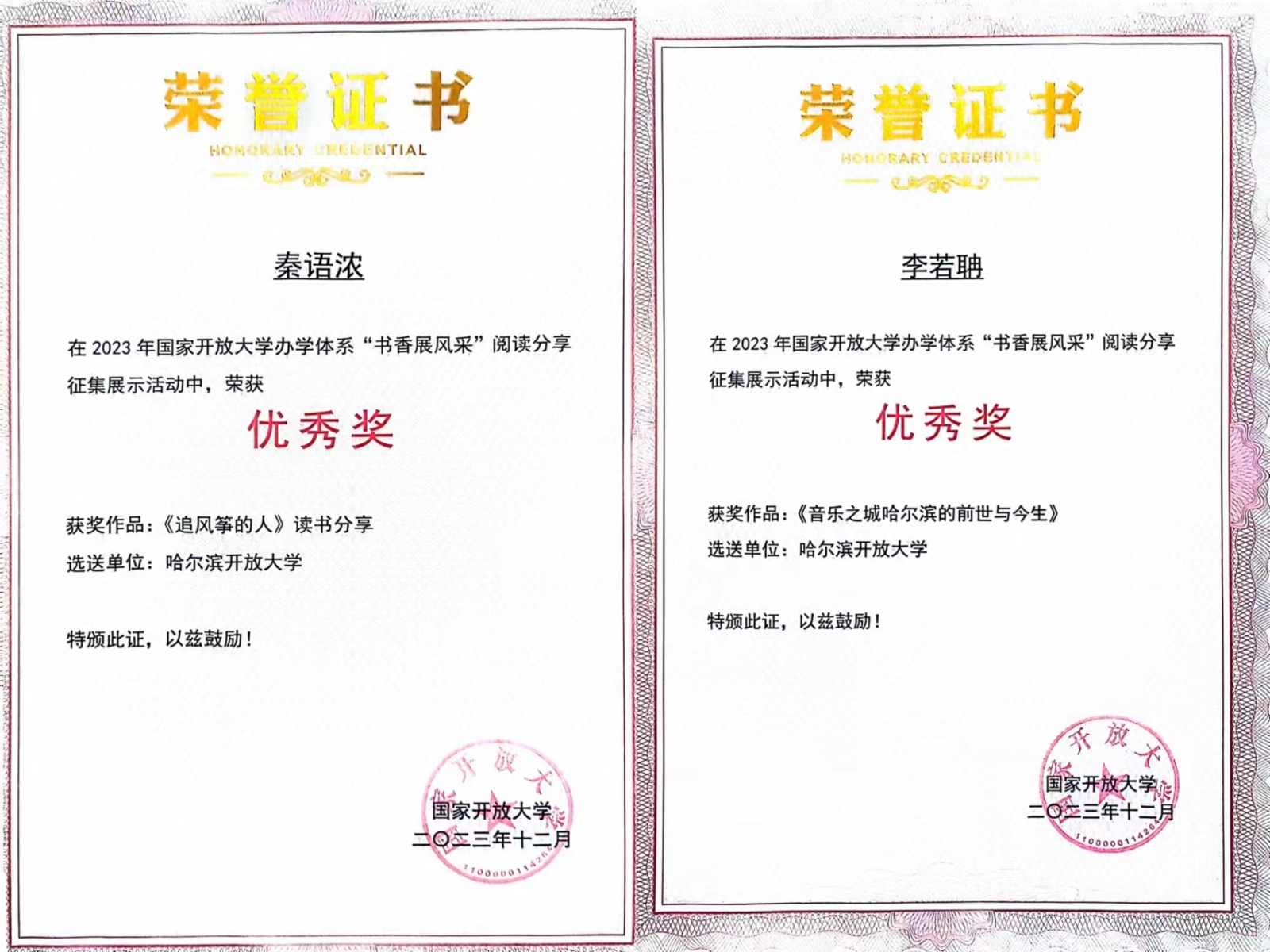 近日,国家开放大学办学体系“书香展风采”阅读分享征集展示活动公布评选结果,爱游戏(ayx)中国官方网站推荐的秦语浓老师《追风筝的人》和李若聃老师《音乐之城哈尔滨的前世与今生》两部作品喜获教师组优秀奖。